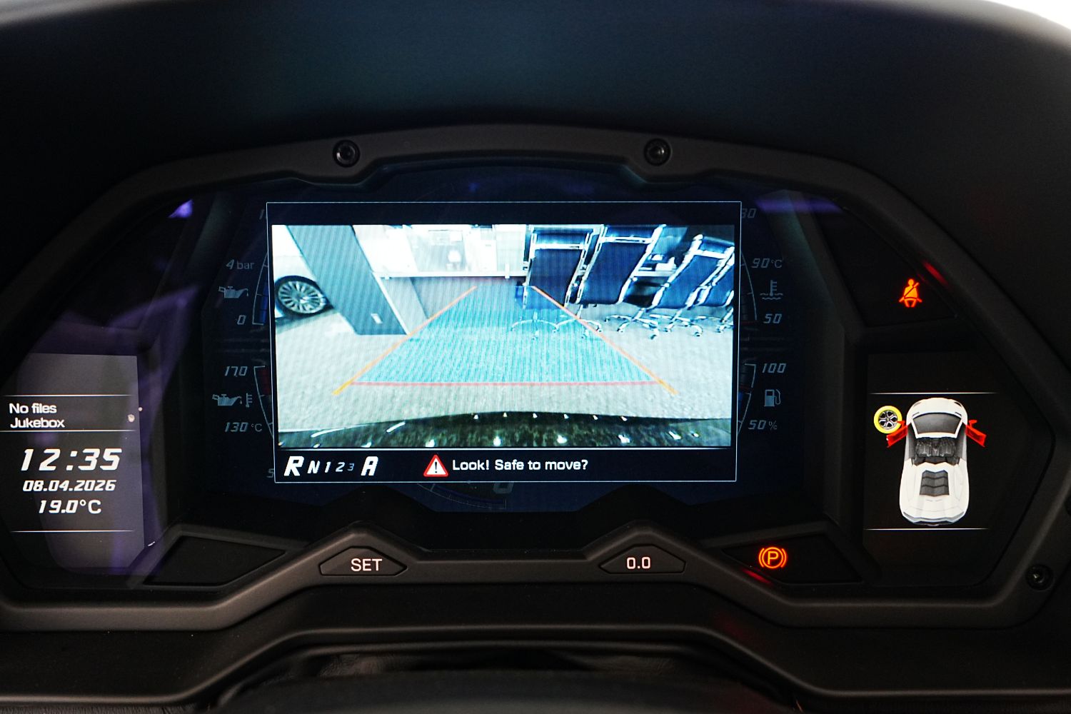 赤い蓋を開けてエンジン始動すれば、6.5L V12エンジンが唸り、甲高いマフラー音が吠えます!
