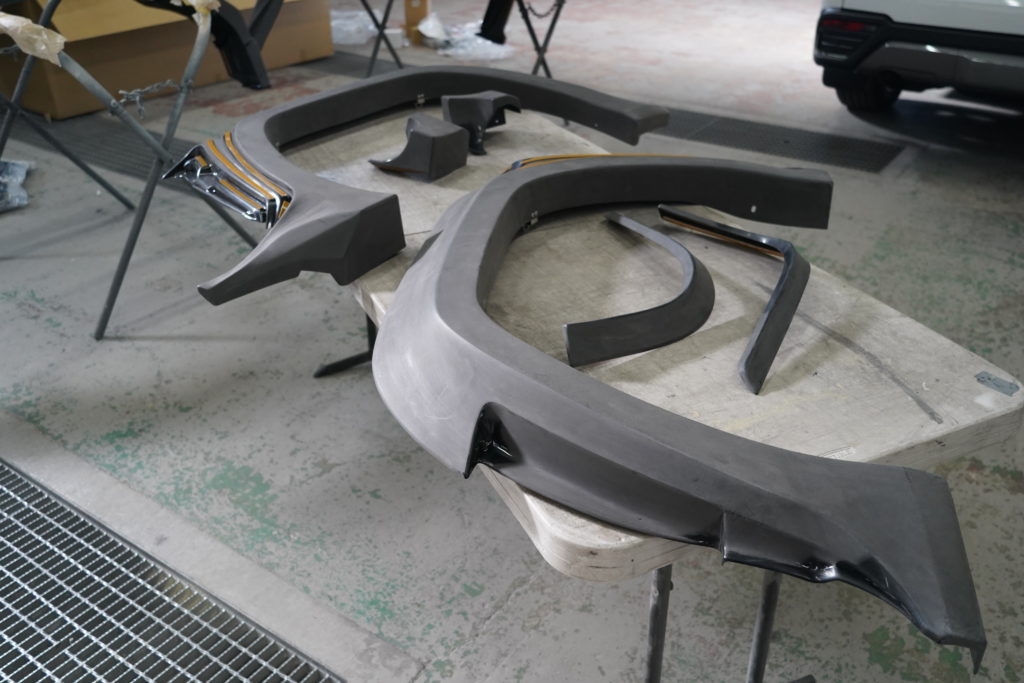 カスタムパーツは、前後のバンパー、オーバーフェンダー、サイドステップ、ルーフスポイラ、背面タイヤカバー等