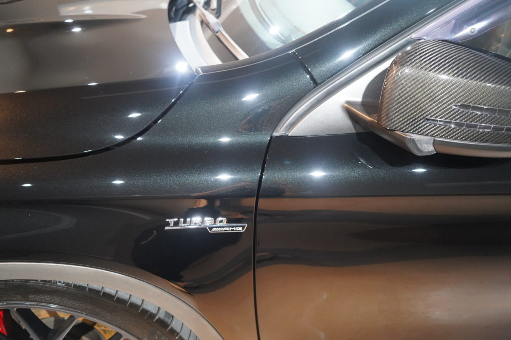 今回はこちらのGLA45ですが、左のドア、クォーターを板金修理して、そのままコーティング施工しました