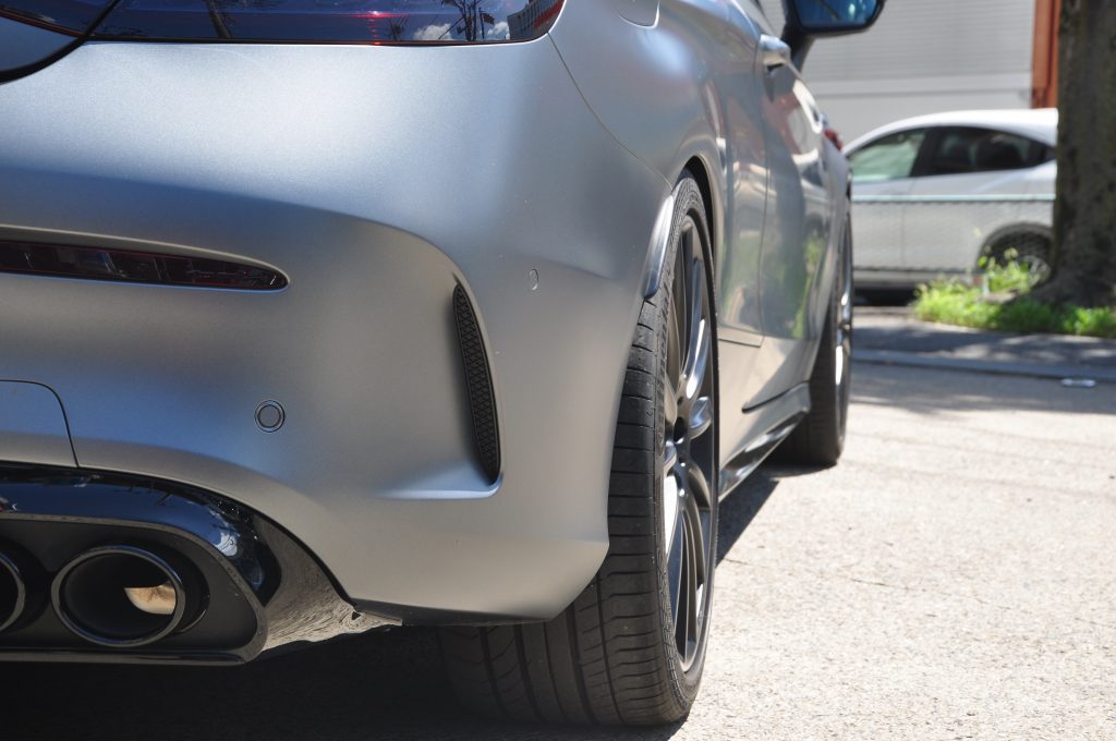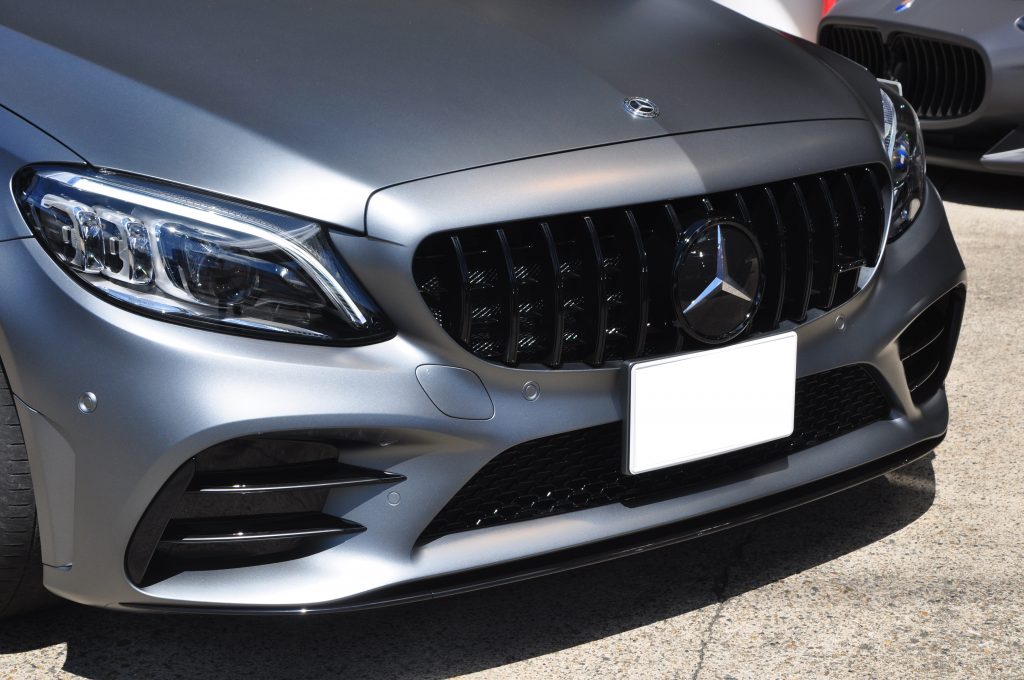 フロントは、元々グロスブラックのパナメリカーナグリルが装着してありましたので、それに合わせてダクト周りやシルバーのトリムもラッピング&ペイントでグロスブラックに![]()