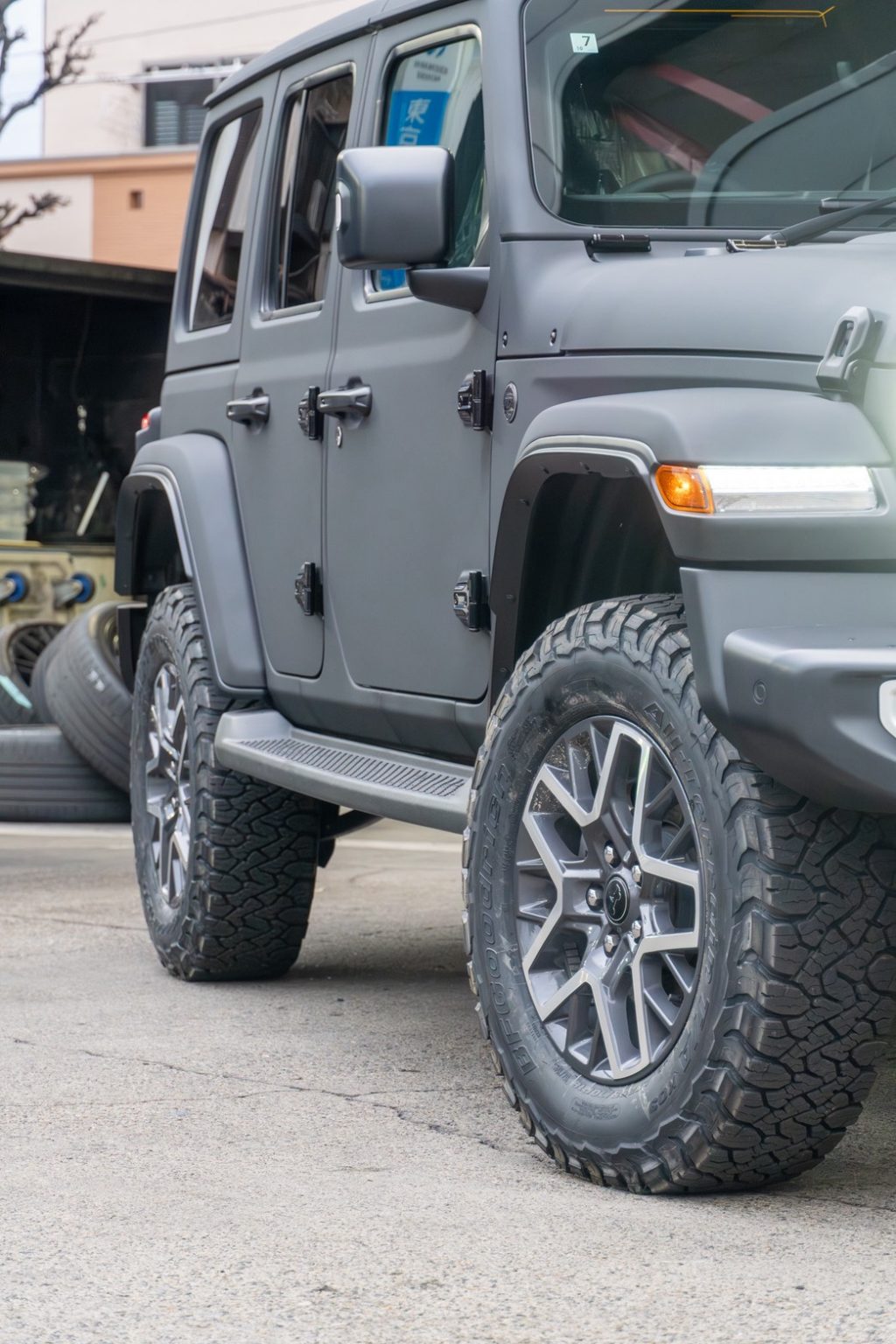 入庫前からフルラッピングされた生かした一台をリフトアップ+タイヤ交換にて