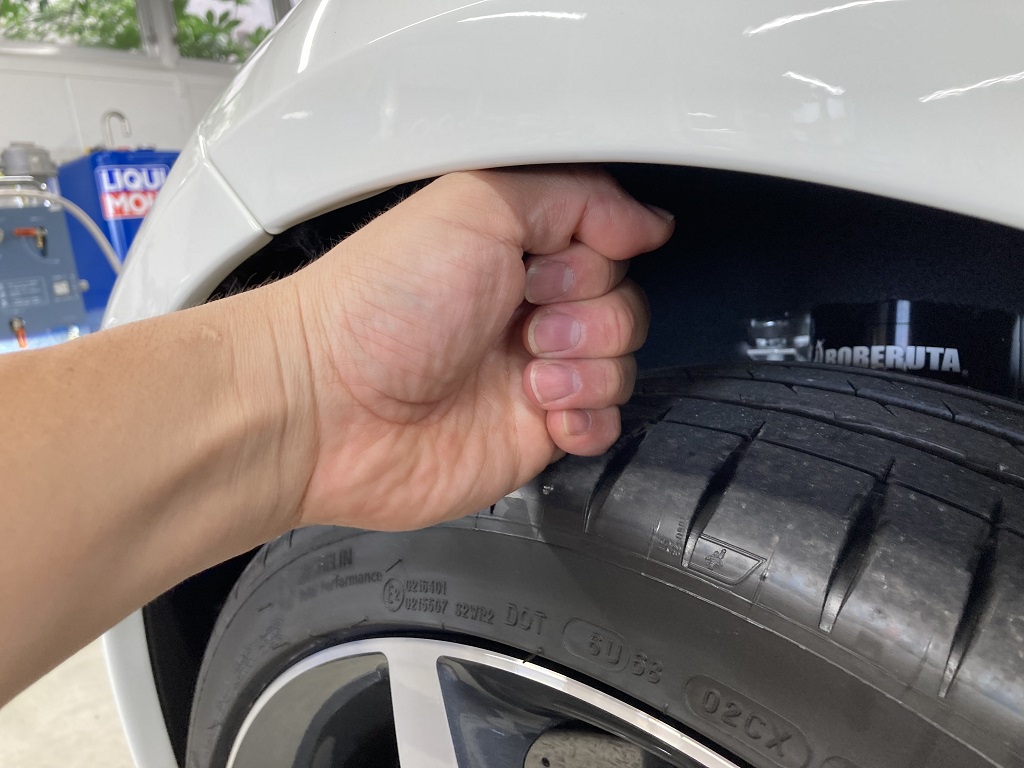 拳も余裕で収まりますのでダウンサスを付けてもリフトアップ時はノーマル車高よりも高くなっています!