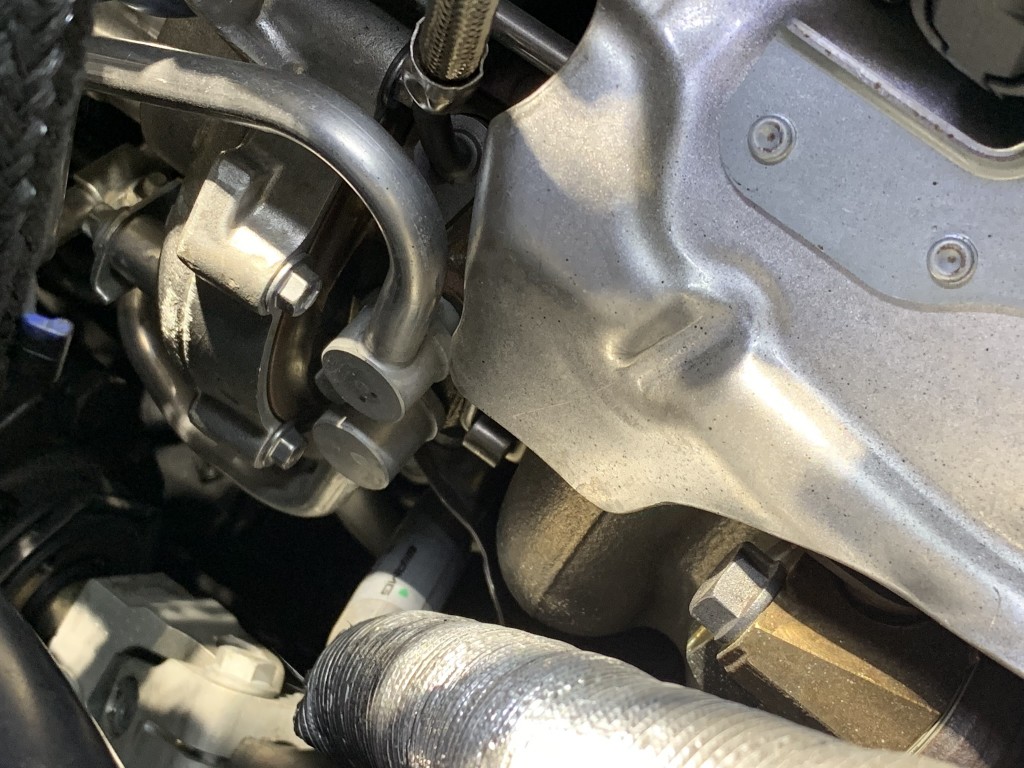 エンジンのシリンダーブロックとタービンにつながるパイプの付け根から漏れています。
