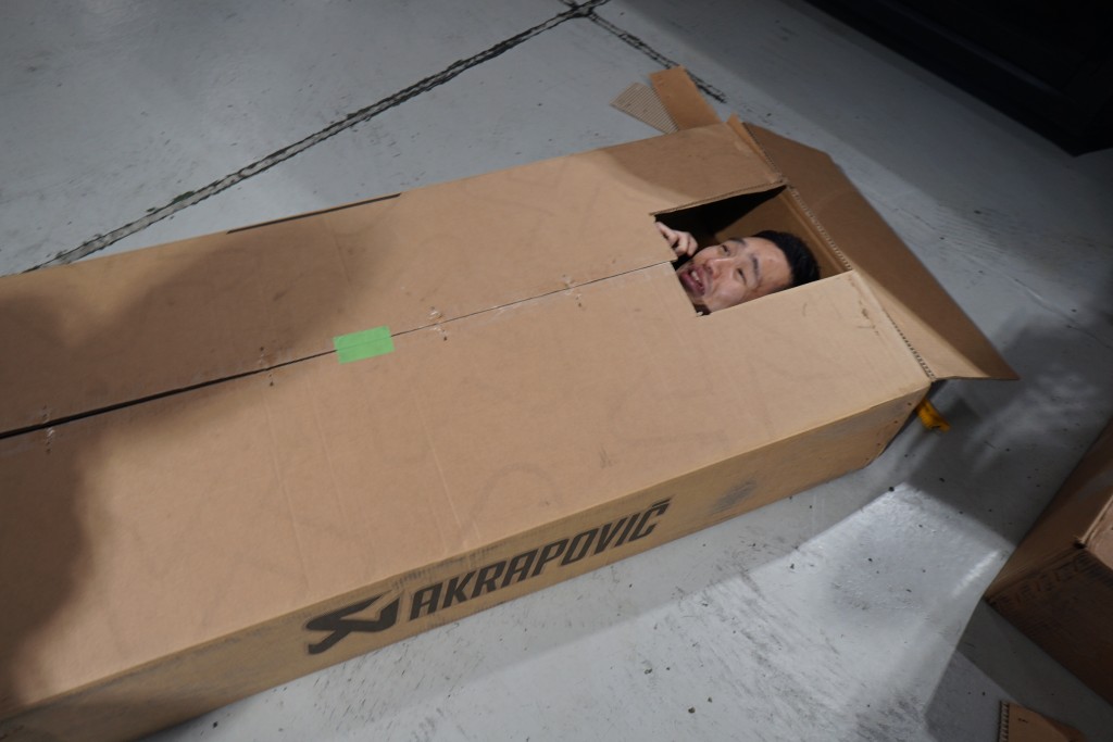 AKRAPOVIC お取付でございます!!!!!(写真は真面目なお仕事のお電話をダンボールの中でする石井さんでございます。カスタムや車検・整備のご相談は是非石井までご相談ください。)