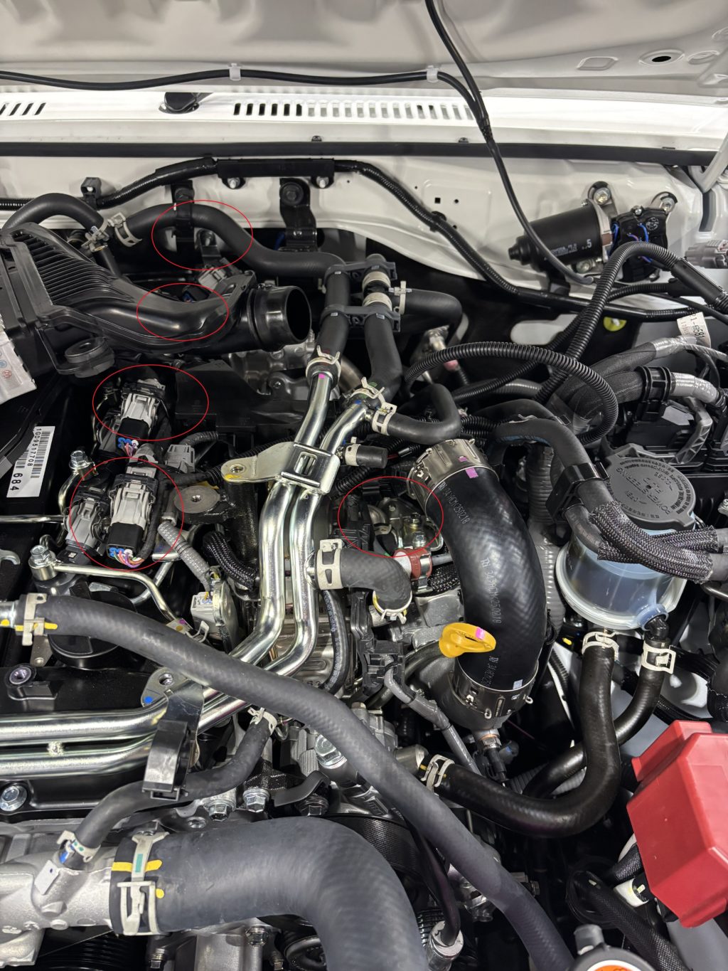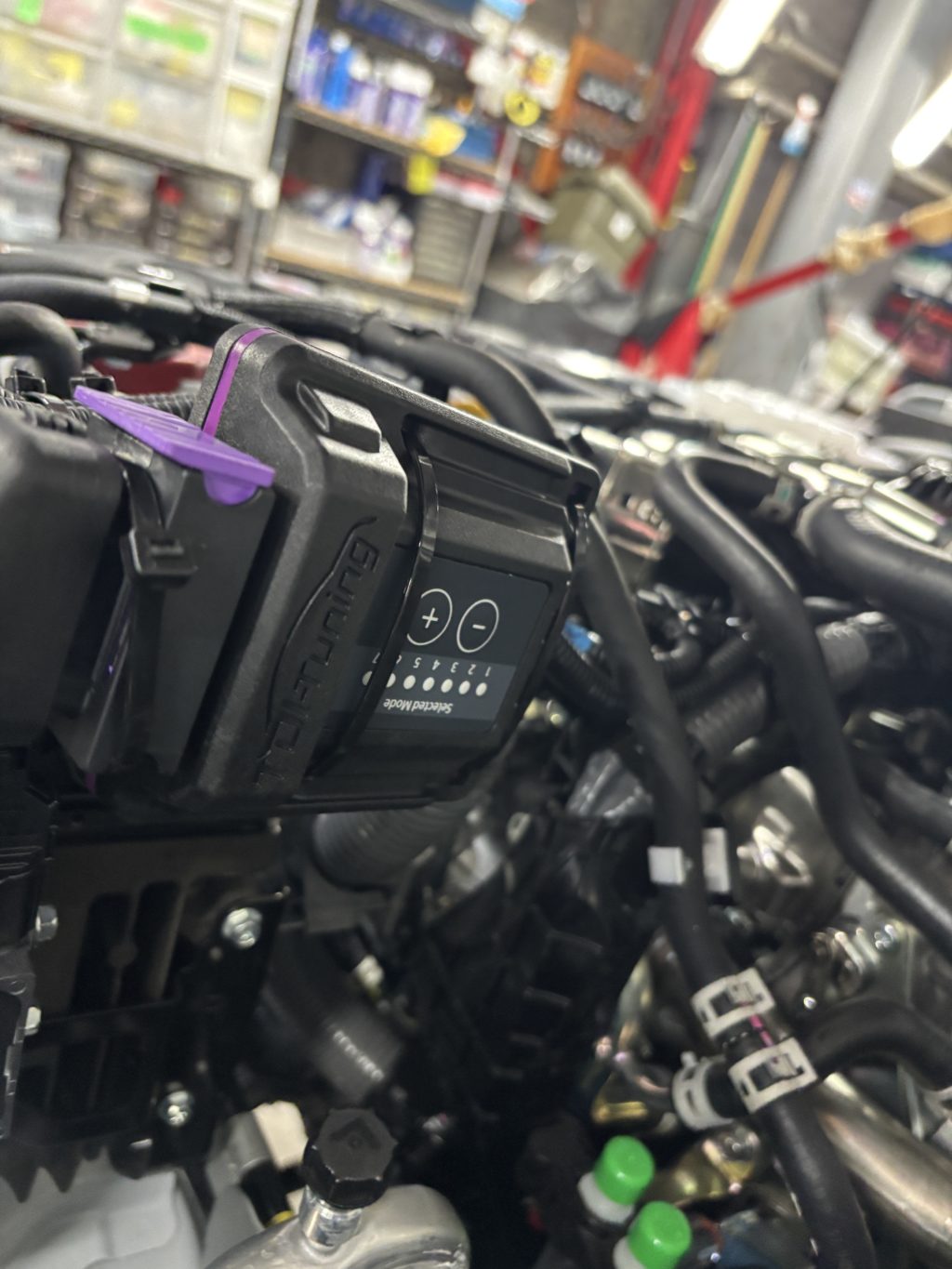 赤丸の印のIGコイルとブースト圧センサーに割り込ませるだけで