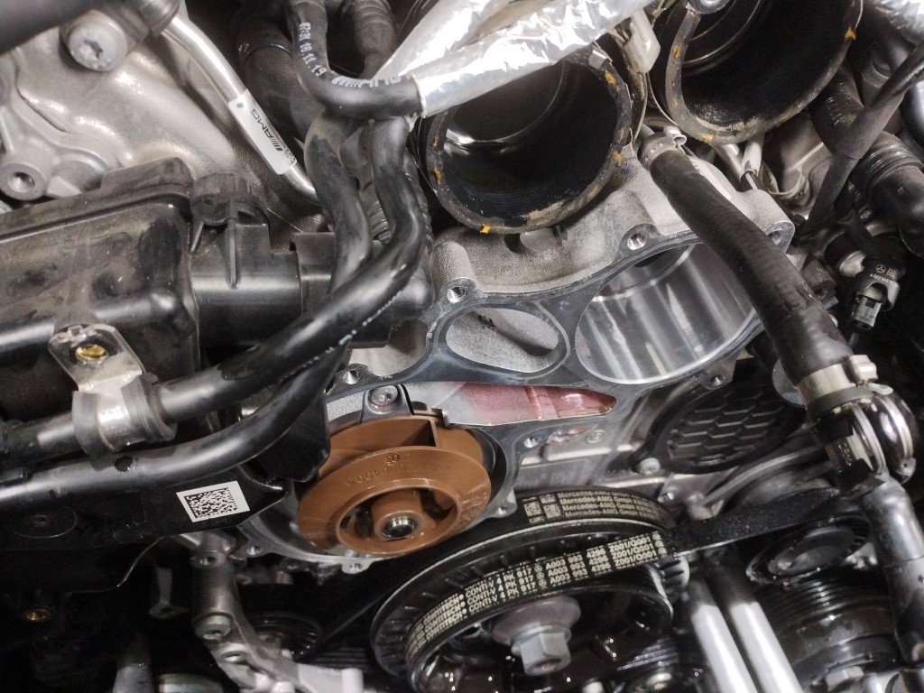 外れました、茶色いのがウォーターポンプです、ウォーターポンプは特に不具合は出てないのでそのまま使用します
