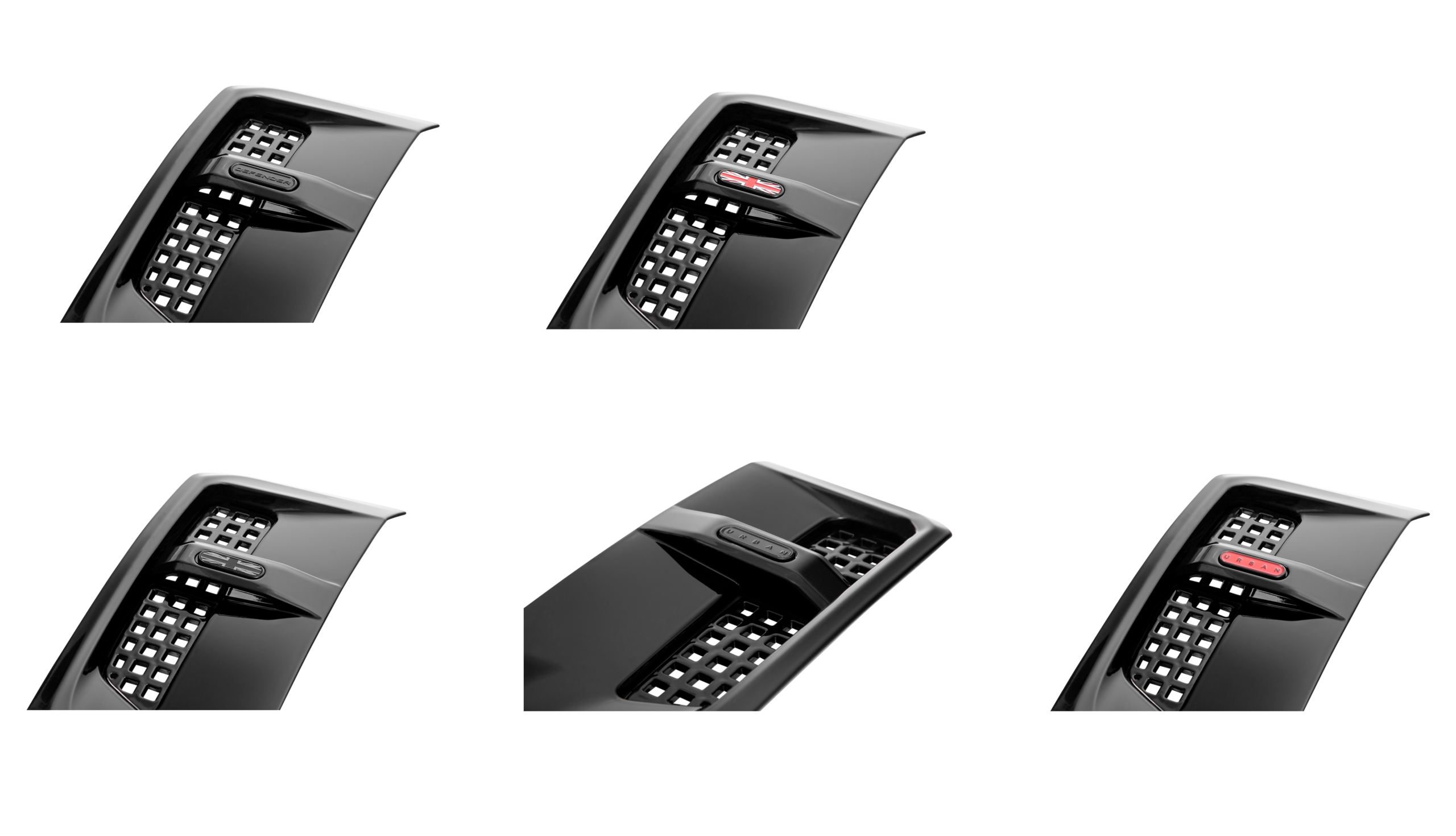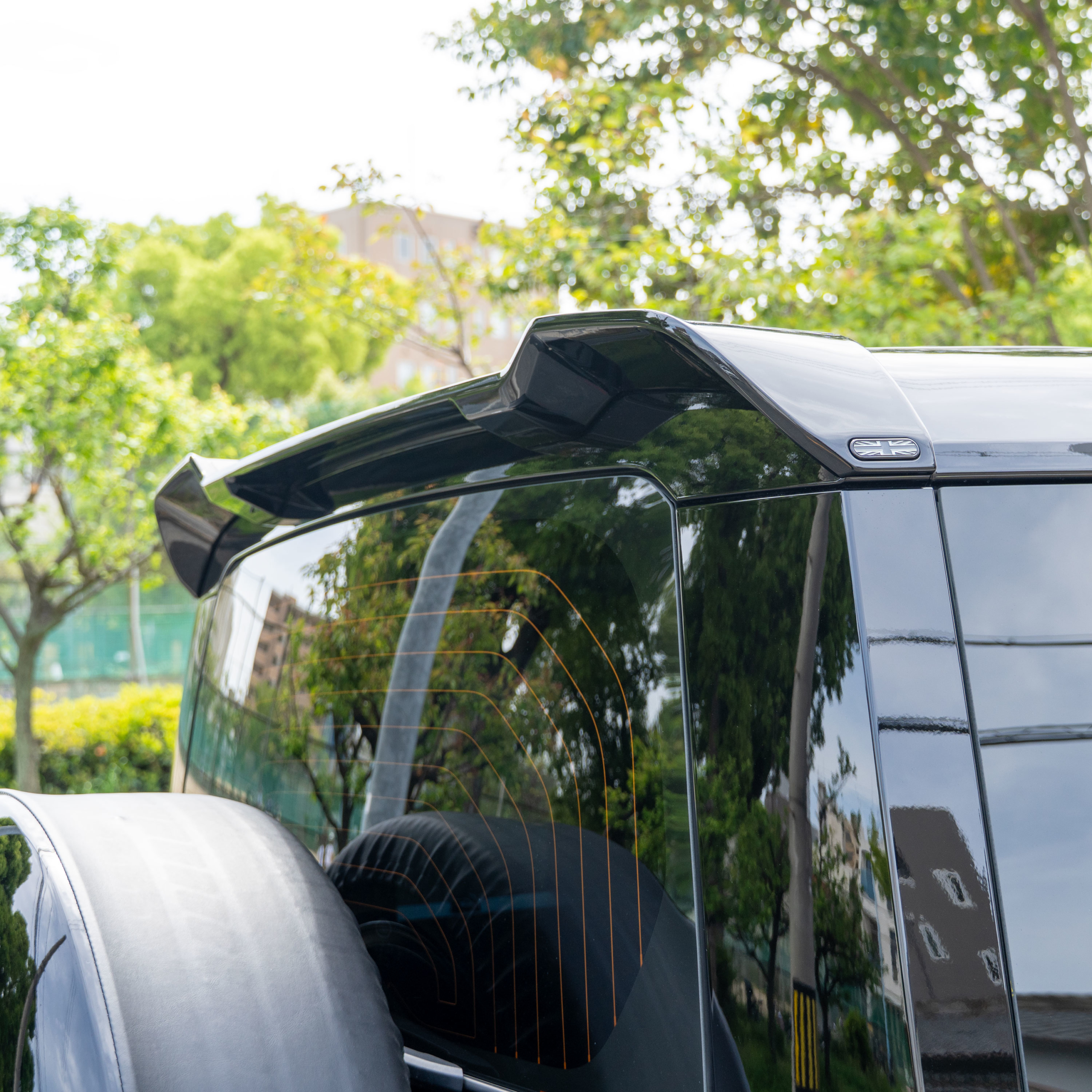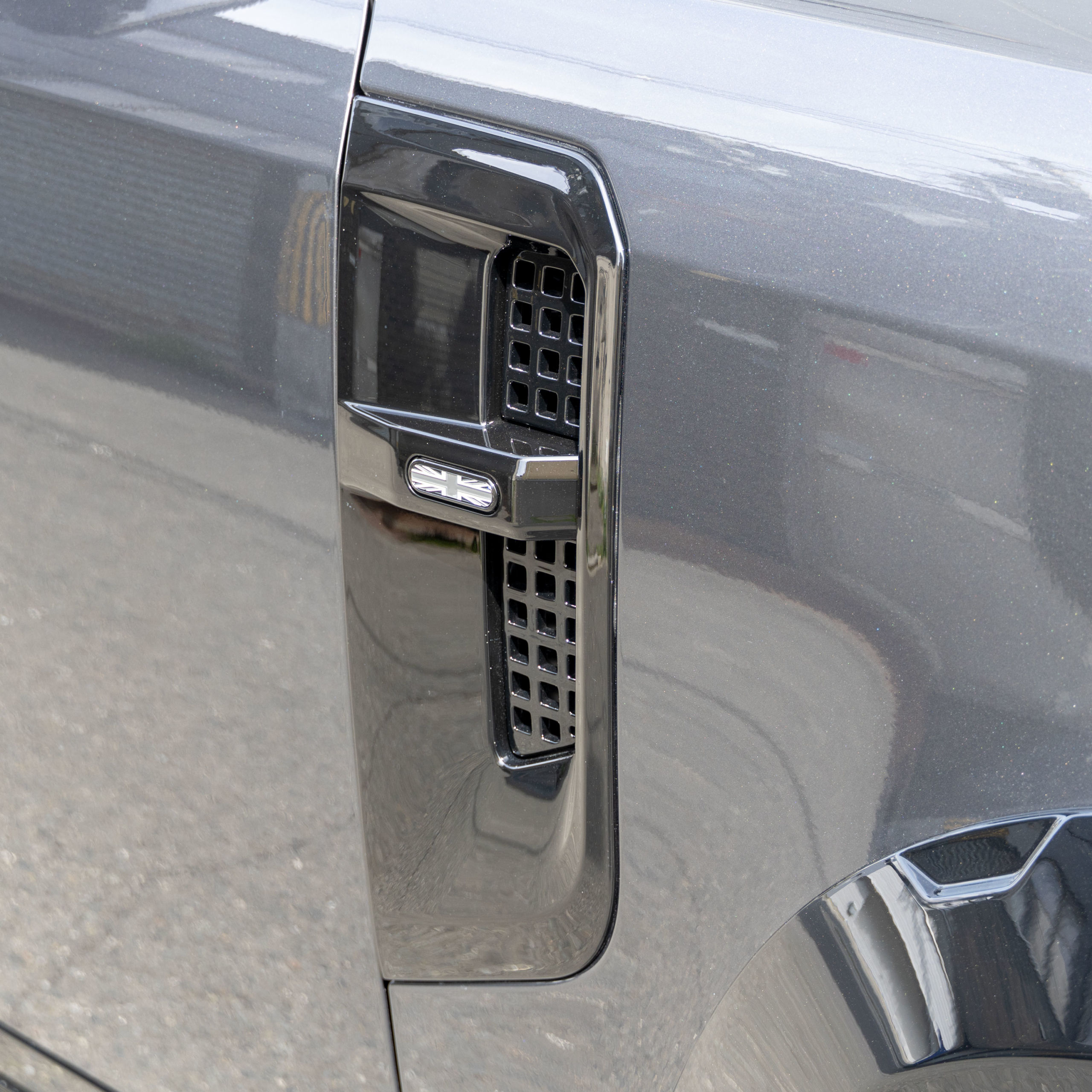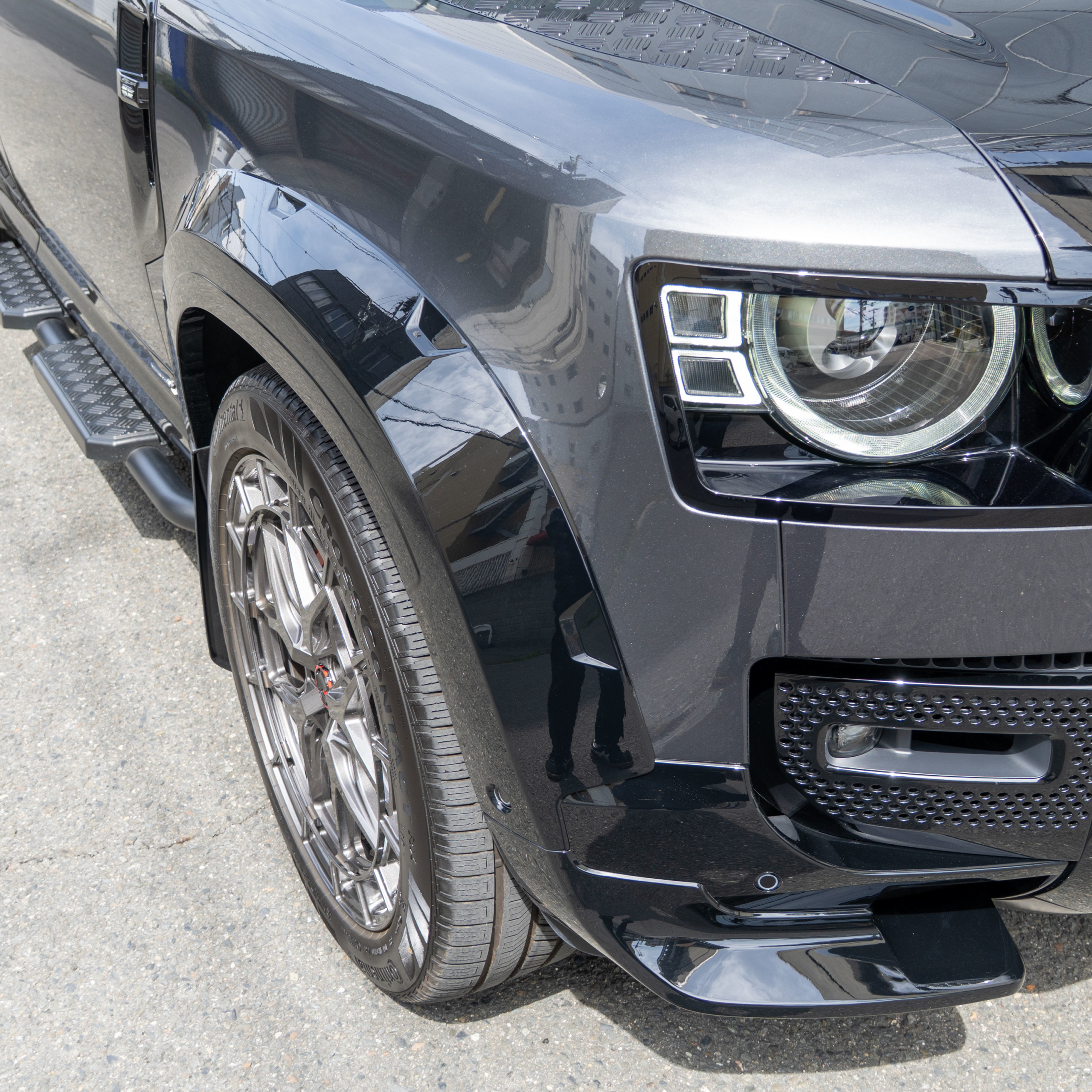 ディフェンダーのフロント廻りってツルっとした印象で丸みが強調されており、張り出しのあるスポイラーを装着する事で厚みが増しイメージがガラっと変わります![]()