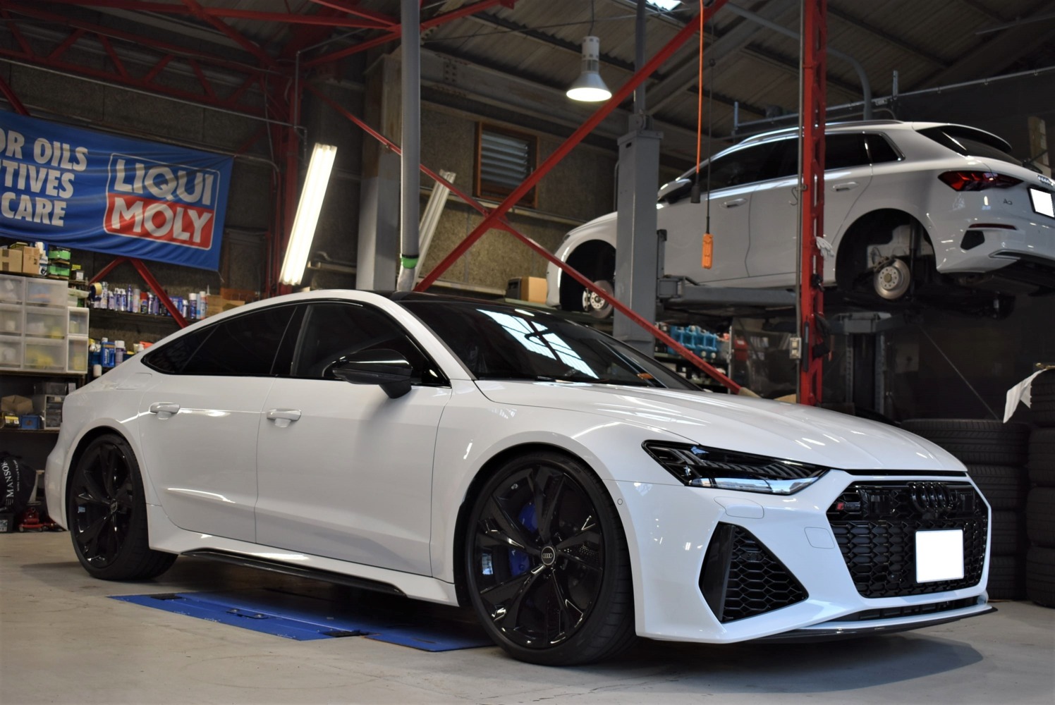 本日ご紹介いたします御車は、以前に車高ローダウン&MAXTON Designのスポイラーなど取付させて頂きましたAUDI RS7