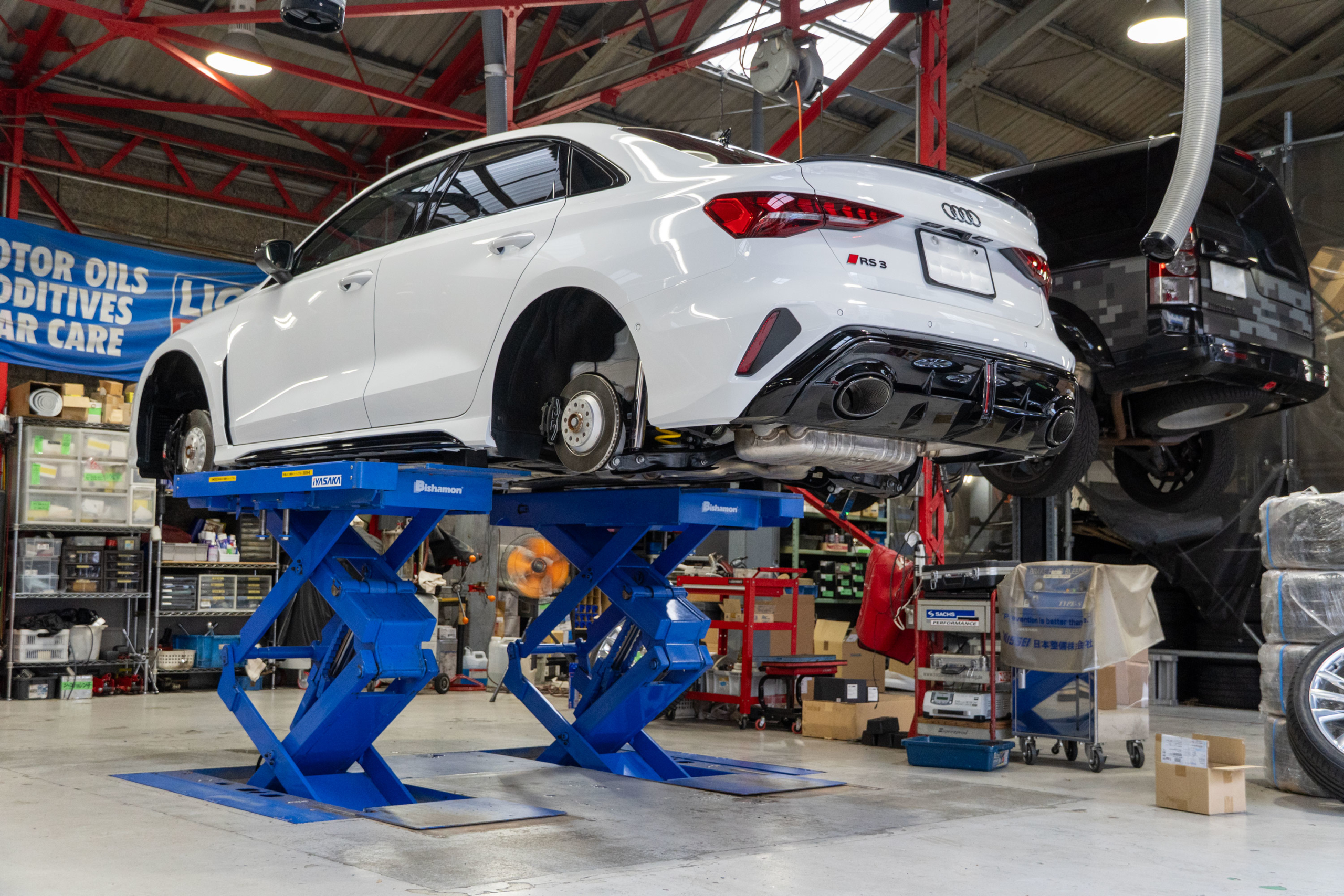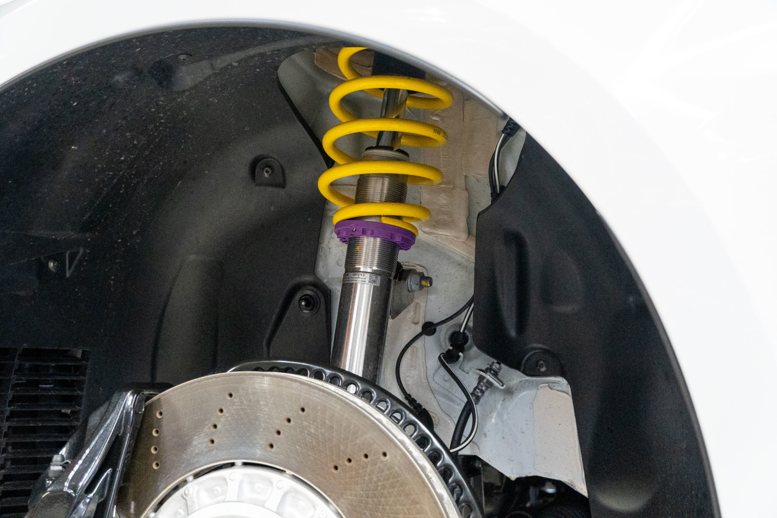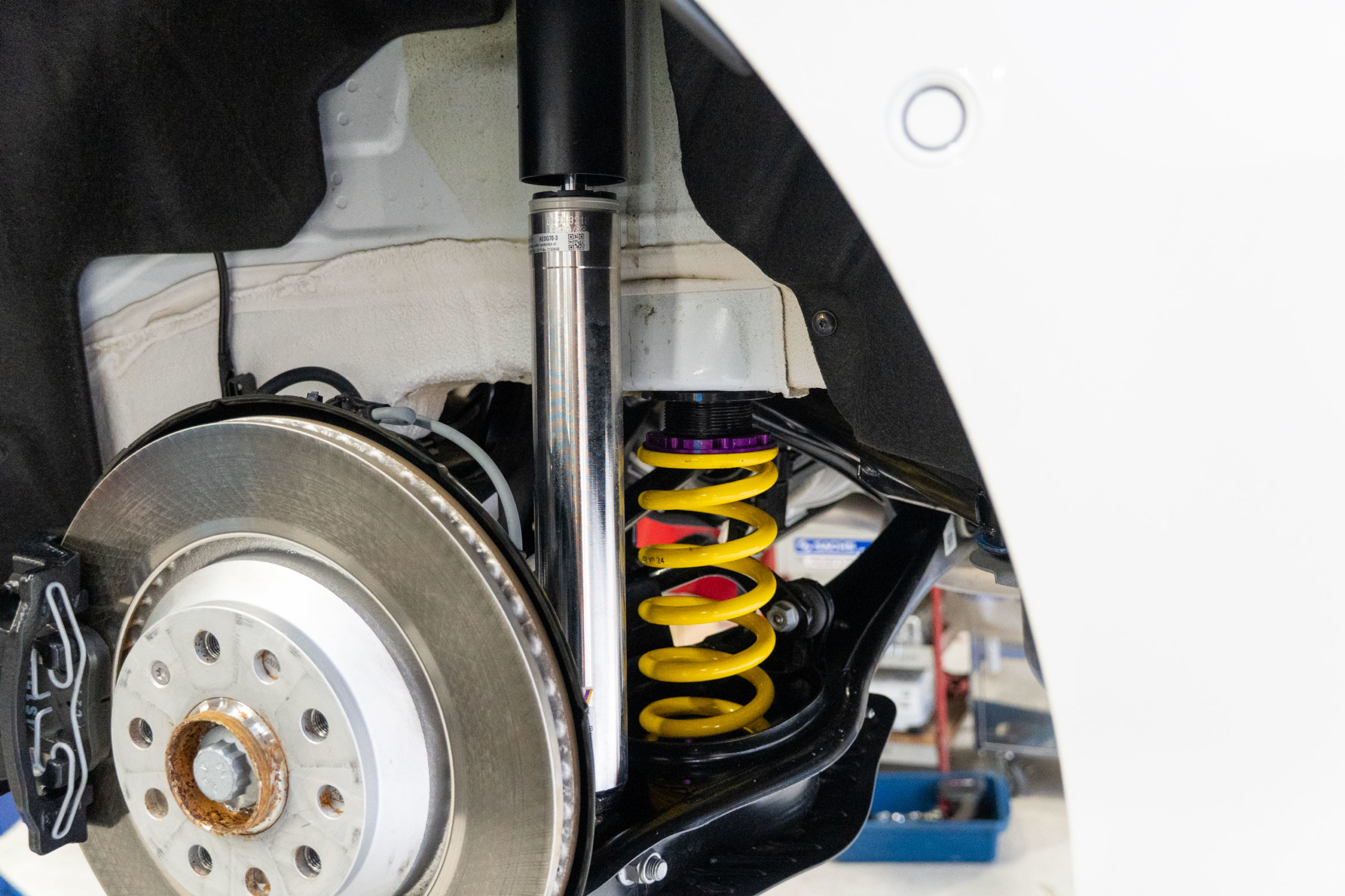 早速リフトアップし作業に掛かっておりますが、まずはKW ver3車高調キットを装着させて頂きました